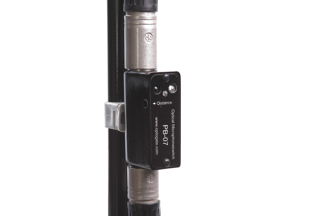 The PB-07 is an automatic microphone gate and is based on the latest optical technology. It is equipped with an infrared sensor. On this model the sensor is on the flat side. Like the other models the PB-07 will switch on the microphone if someone is in front of the mic. The PB-07 is inserted between a microphone and the xlr mic cable or on a gooseneck stand. On the back of the unit is a 4mm threaded hole if you choose to use the supplied plastic clip and screw to mount on the PB-07. You will then clip it to the mic stand and the clip will disappear behind the stand. The PB-07 can be connected to a gooseneck microphone as well.
